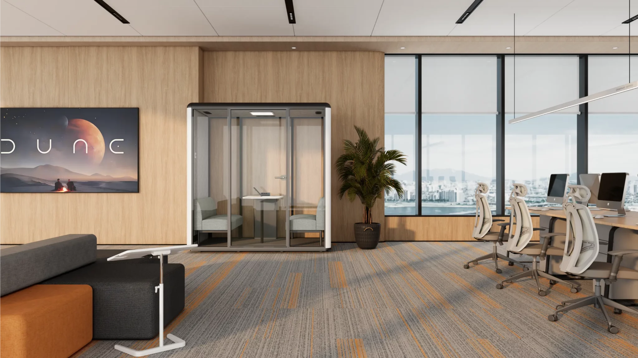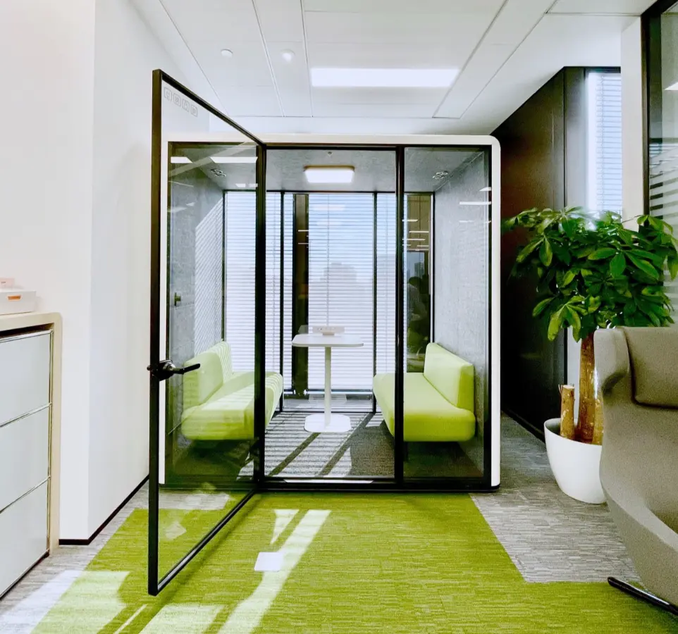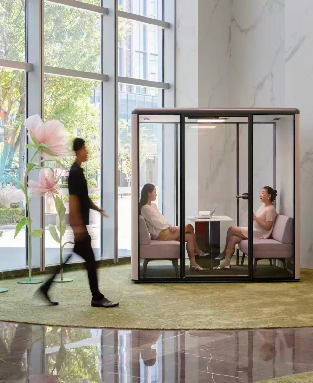 Grâce à sa conception multicouche intégrant des matériaux acoustiques haute performance, la cabine réduit efficacement le bruit ambiant et garantit un environnement propice aux échanges et à la concentration.